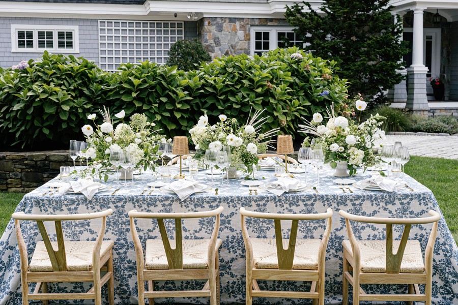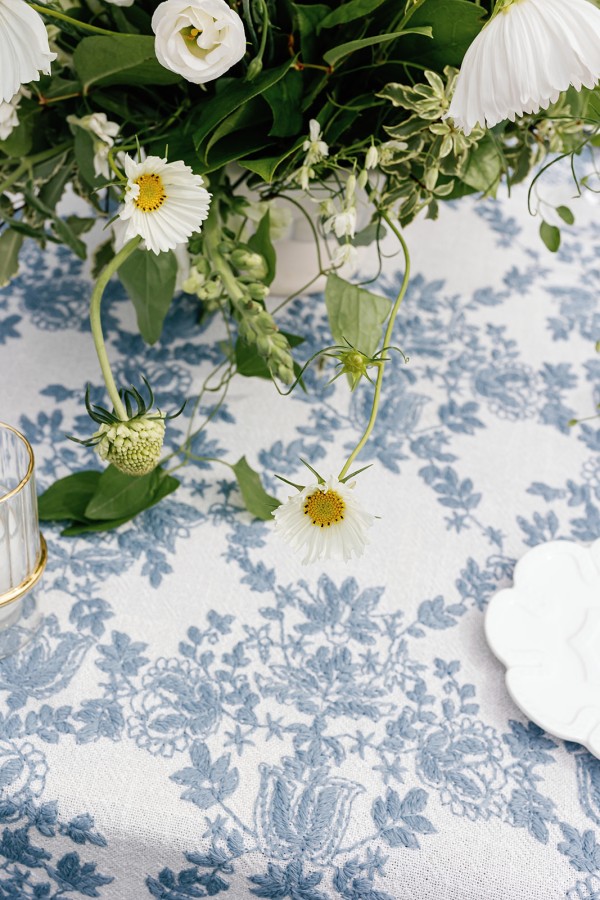 Tranquil blue tablecloth detail close-up Camille Lake table linen in soft blue hues Harbor Point blue linen styled for serenity