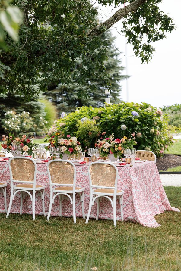 Hidden Garden Hibiscus floral table linen detail Harbor Bay floral fabric styled under natural light Red and blush pink floral fabric close-up Painterly floral tablecloth with hibiscus motifs