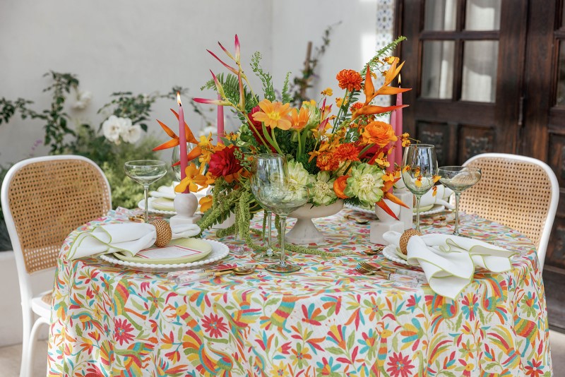 Balance the color with intention. Every layer should feel like part of the same conversation: pattern, texture, placement. Ground your design with woven chargers or raffia placemats. Add dimension with Mexican tile-style dinnerware, handblown glassware, or traditional Talavera pottery.