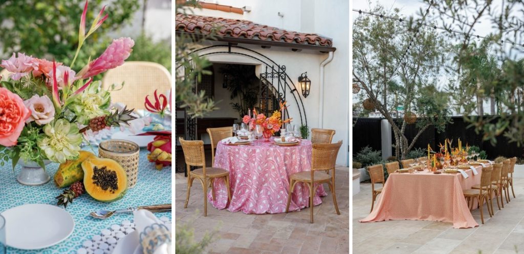 Florals should reflect the same energy… think bold dahlias, ranunculus, or bougainvillea in lush, low arrangements. Finish the look with thoughtful accents like citrus garnishes or edible blooms to elevate your drinks and desserts.