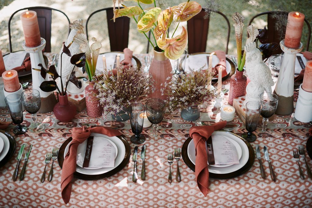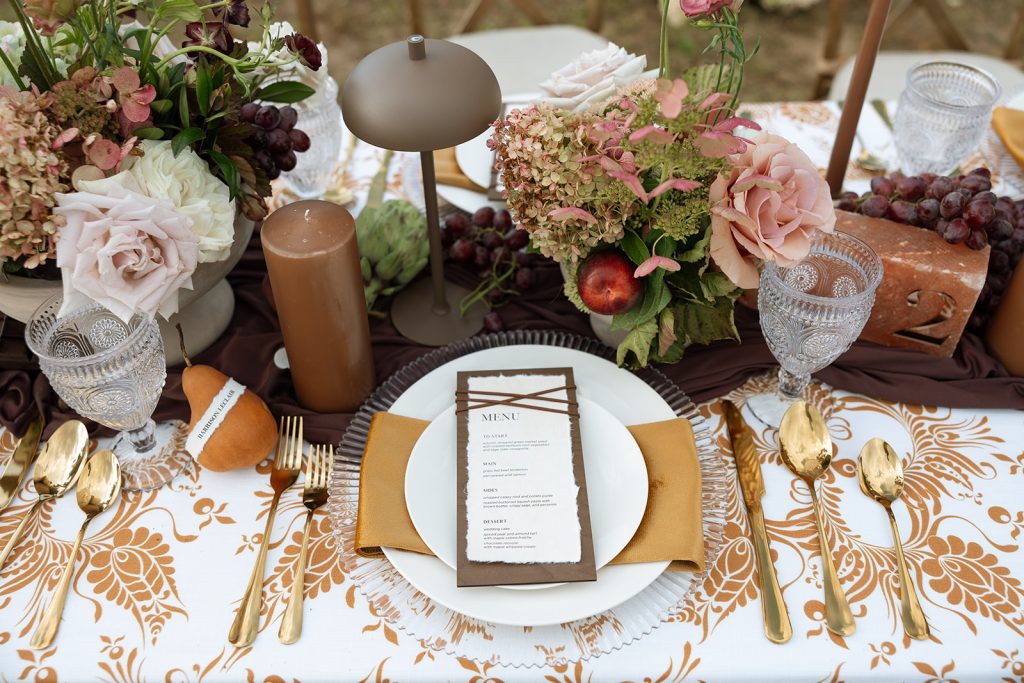 Designers: The Distilled Collective & Magnolia Bluebird | Photography: Eli Turner StudiosThe beauty of pattern in fall design is its ability to layer. A patterned linen creates energy, while complementary solids in velvet or satin napkins add depth, and metallic chargers frame each place setting with precision. Together, these elements create rhythm and texture, a table that feels curated rather than arranged.