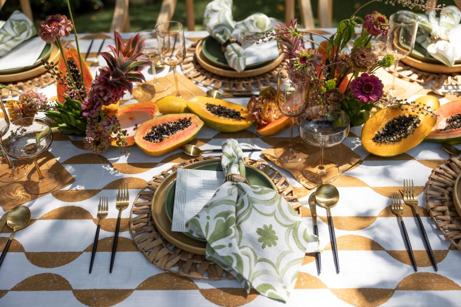 Add high-impact sparkle to any event with the bold glitter of sequins on Zelda linen. Gold sequins are woven into a triangular geometric pattern against a soft ivory sequin background for the perfect balance of shine and texture. The Alloy Collection linen has metallic shades woven into a soft.