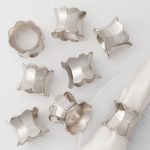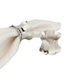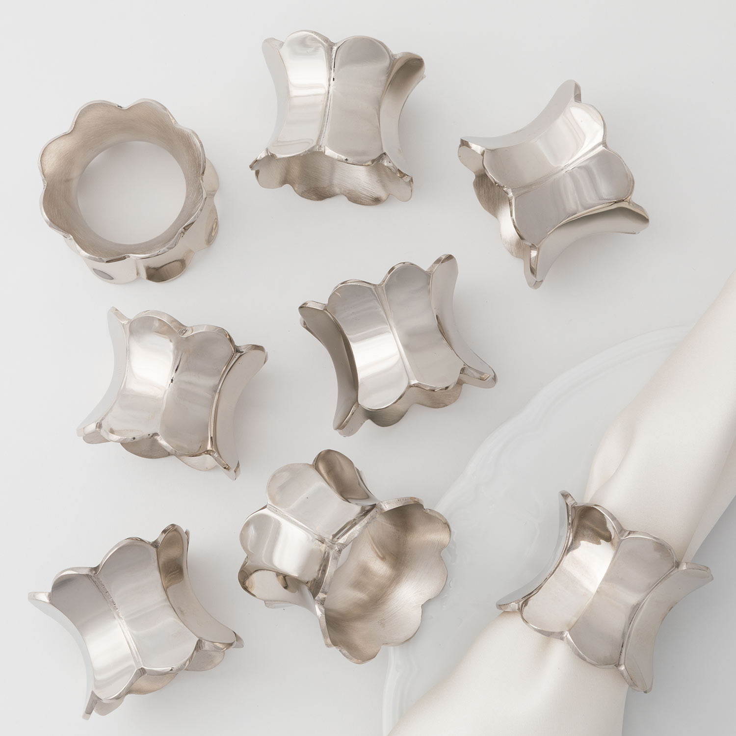 A polished silver napkin ring with a sculptural scalloped edge and reflective metallic finish. The fluid silhouette introduces cool-toned luminosity.