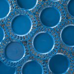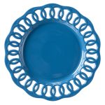 A glazed ceramic charger plate in luminous cornflower blue with a sculptural pierced rim. The high-gloss finish enhances reflection and depth, while the dimensional edge introduces architectural presence.
