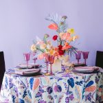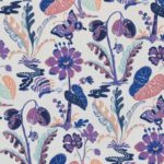Step into a whimsical fantasy garden with our Boogaloo Ultraviolet Table Linen. Featuring enchanting colors of white, navy, light blue, peach, purple, and dusty rose, adorned with playful plant patterns and delicate butterflies, this linen sets the stage for an ethereal dining experience.
