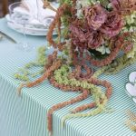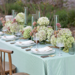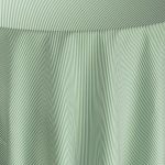 A laurel green woven stripe tablecloth offering organic depth through narrow linear banding. The balanced stripe grounds the table with tailored polish and tonal richness.