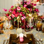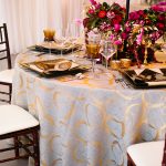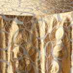 Regal shimmering gold pops against the matte stone-gray background of Gold Halo linen. The circular design creates a shimmering, retro pattern against the soft hue for the perfect balance of shine, color, and bold design. The Halo collection’s unique pattern provides interest and depth to a table design, perfect for any special occasion.