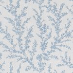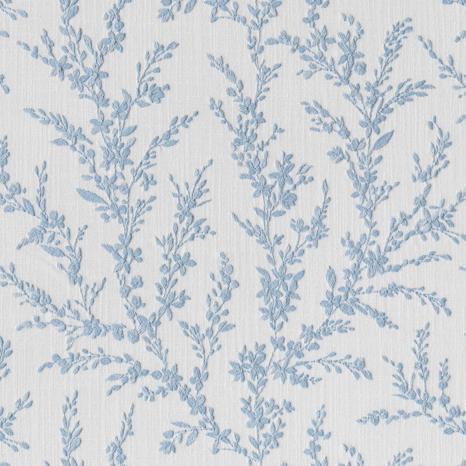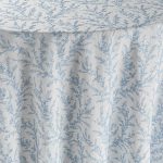 A light blue embroidered floral tablecloth featuring intricate vine stitching in serene hues. The dimensional threadwork balances heritage detailing with fresh tonal clarity, adding texture through layered embroidery.