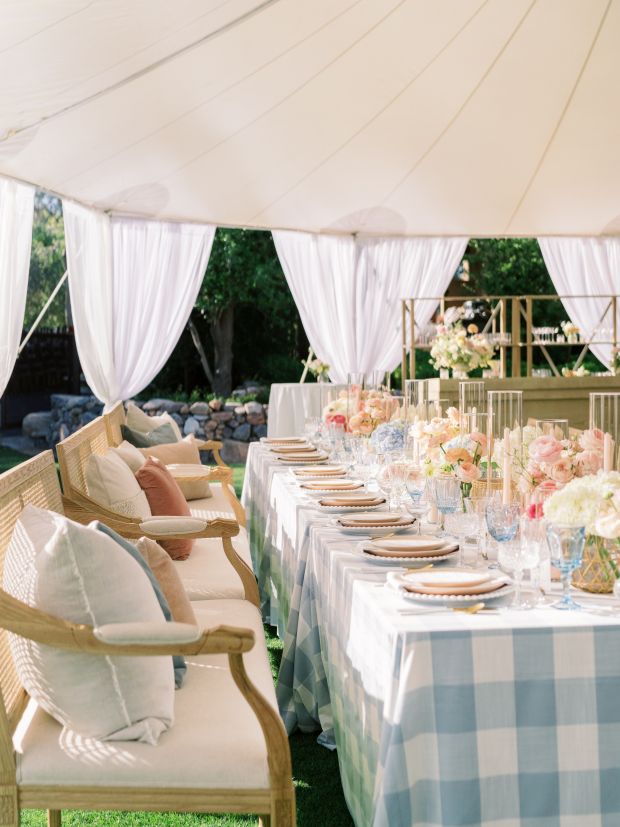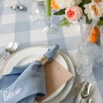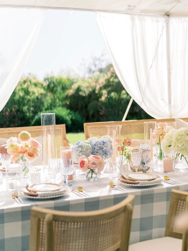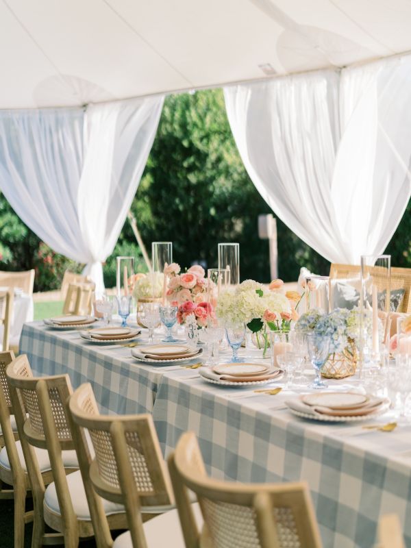 The large alternating dusty blue and white squares on our Lake Buffalo Check table linen creates an upscale chic checkered design that instantly adds depth to any event. This inspiring and recreational design will have you dreaming of ways to get outdoors. Rent it here along with other linen from this collection at BBJ Linen.