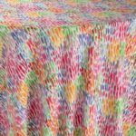 Inspired by sprinkles from a rainbow the irregular pattern reminiscent of pointillism is bold and whimsical. This statement cloth adds an unforgettable design element.