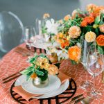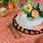 Modernist lines, brilliant color, and art nouveau inspiration. This linen is a striking apricot-orange color, patterned with thin white outlines of modern, abstract shapes. Inspired by the Art Nouveau movement, Russet Nouveau honors the blending of high art with the craft movement of the early 19th century. It offers a refined palette, a graphic design sensibility, and a crisp, clean foundation for any tablescape. Rent it here along with other linen from this collection at BBJ.