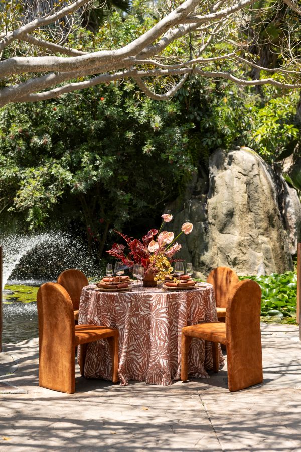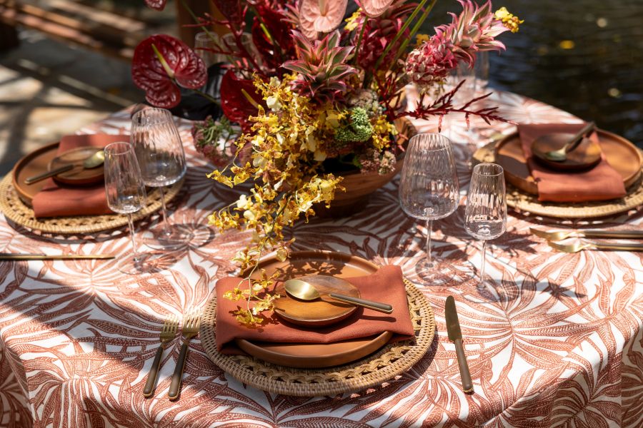 The Areca Sienna Runner distills the design’s earthy palm rhythm into a versatile accent, lending depth to layered tablescapes.