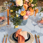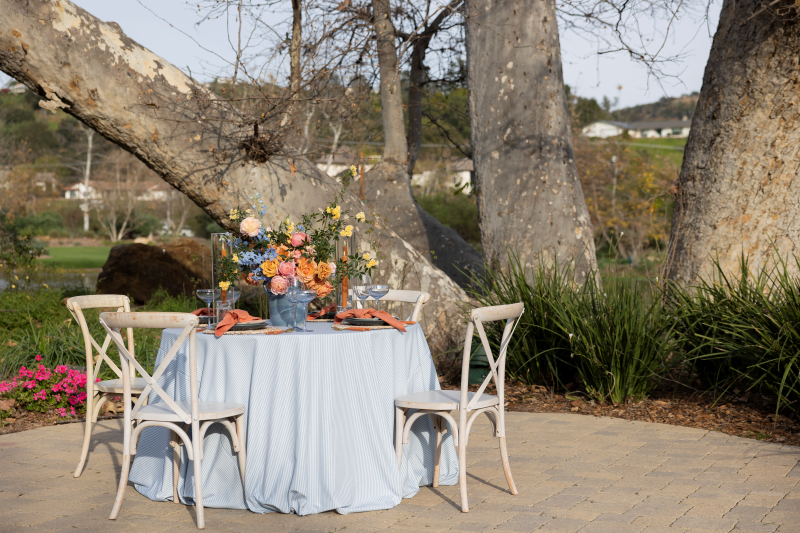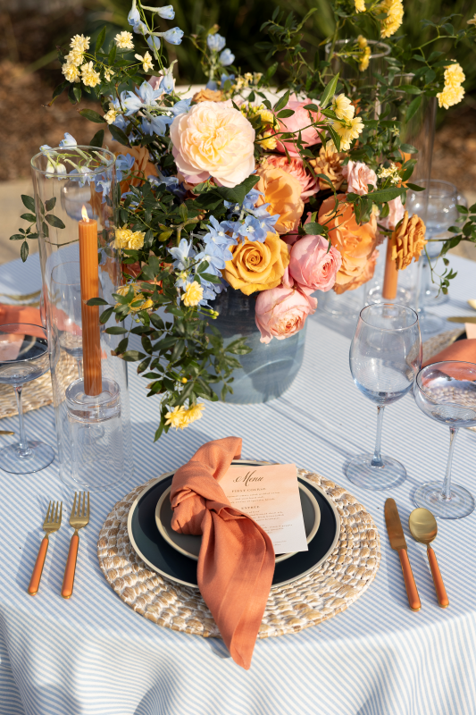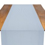 A provence blue stripe table runner featuring elongated vertical lines and balanced structure. The woven stripe sharpens definition while maintaining lightness.
